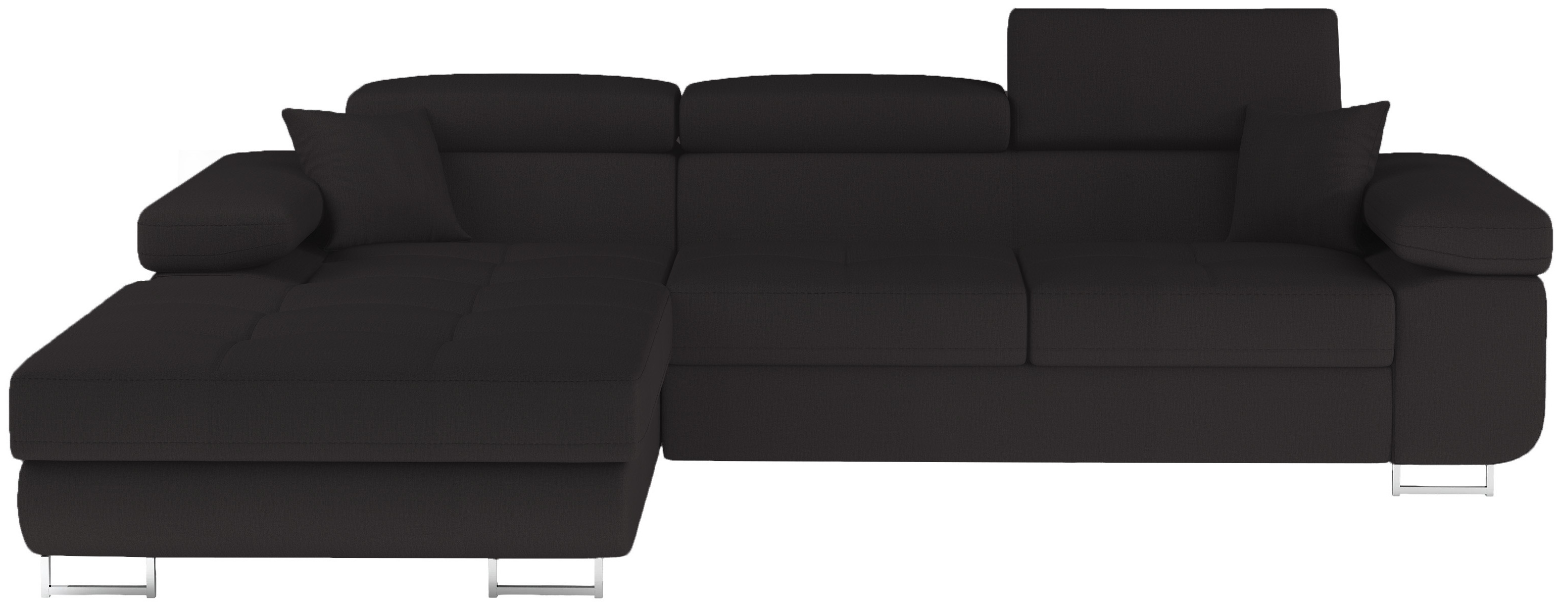 Modern interiors are very refined in appearance. The constraint in the use of accent features lends itself to creating a unique ambiance and space to enjoy your relaxation. If you are about to outfit your living room in a new look, and you are seeking upholstered furniture that is as superbly comfortable as you have been dreaming it to be, then the supple Amy corner sofa bed with storage is your choice. The L-shaped layout features large seat cushions accented by fine tufting and elegant stitching. The wide armrests and optimally profiled backrests provide a great sense of relaxation, elevated further by adjustable headrests. The tall metal legs in polished chrome enhance the stunning appearance. The Amy corner sofa bed with storage is available in Black fabric or can be upgraded to Black easy clean velvet or Black eco leather to give it an even more unique look, and delightful in the quality of modern design..