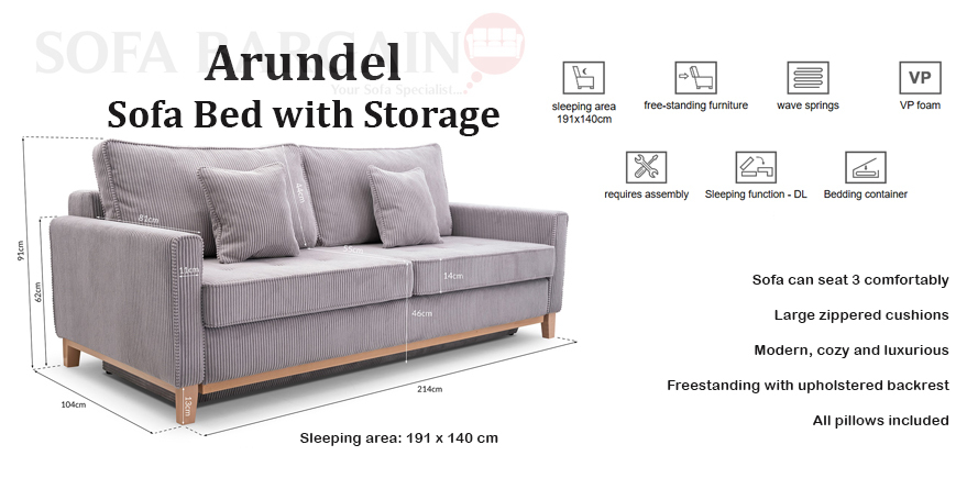 Then you will love the Arundel Sofa Bed with Storage! The couch is the heart of every living room. It is worth choosing furniture so that it not only perfectly matches the interior design of your home, but also provides a comfortable rest for your whole family. The construction of the furniture is made of wood and laminated chipboard, thanks to which the whole is very durable. You can easily unfold the couch thanks to a convenient, automatic mechanism. What's more, the set also includes decorative pillows that will help you create a beautiful arrangement in the living room. Sitting on the couch, you can comfortably rest your hands on the spacious armrests, and every free moment will become very pleasant for you and your loved ones.