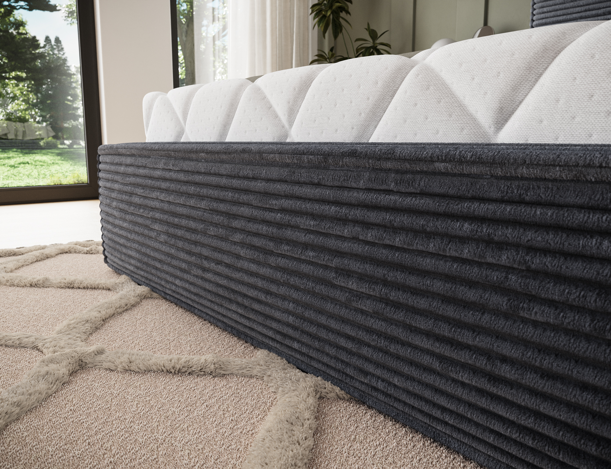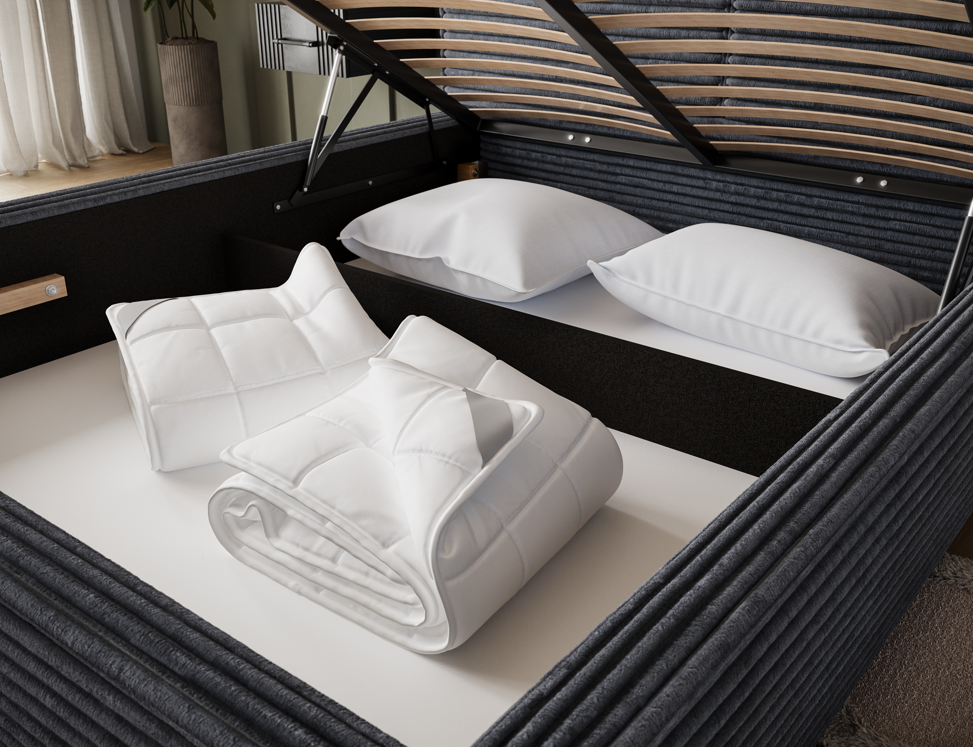 The Basel model is available in three sleeping area sizes: 140x200 cm, 160x200 cm, and 180x200 cm, allowing you to perfectly match the bed to your bedroom space. You can also choose between two types of frames: a metal frame with a gas lift or a wooden frame with a spring lift – both ensure stability, durability, and easy access to the bedding storage compartment. With Basel, you get not only style but also everyday practicality.