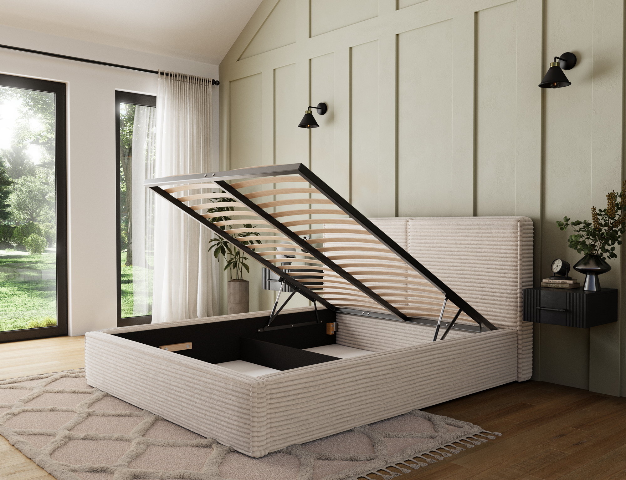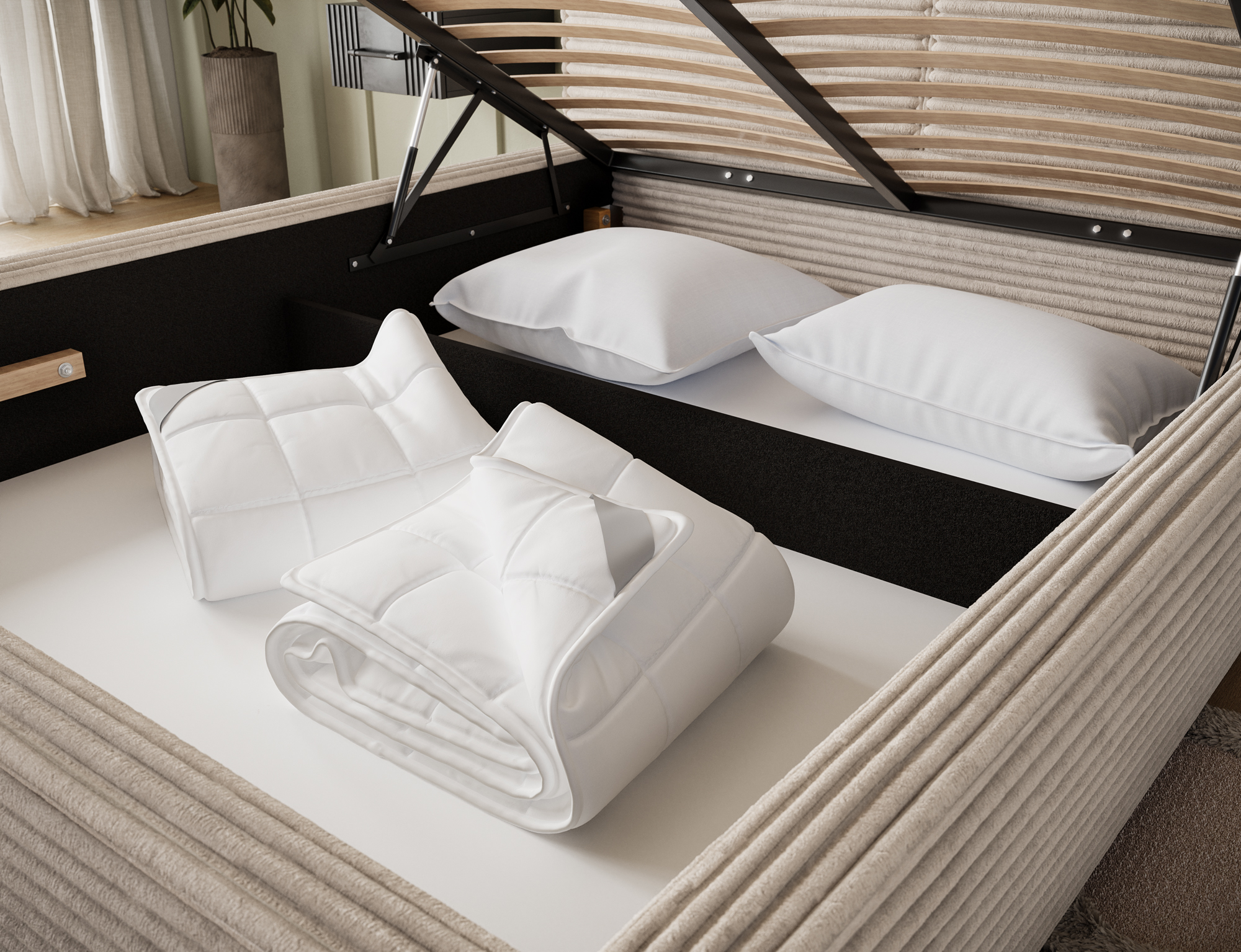 The Basel model is available in three sleeping area sizes: 140x200 cm, 160x200 cm, and 180x200 cm, allowing you to perfectly match the bed to your bedroom space. You can also choose between two types of frames: a metal frame with a gas lift or a wooden frame with a spring lift – both ensure stability, durability, and easy access to the bedding storage compartment. With Basel, you get not only style but also everyday practicality.