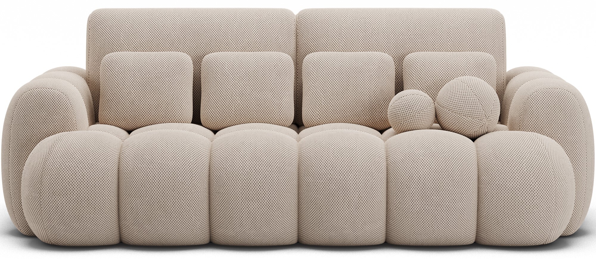 The seat is filled with type B wave springs and high-quality HR3030 and T2315 foams, ensuring both comfort and durability. The backrest features soft cushions filled with foam granules and silicone fiber, while the foldable back section includes additional springs and T2540 and T2315 foams. The set includes four small cushions and two decorative ball-shaped pillows.
