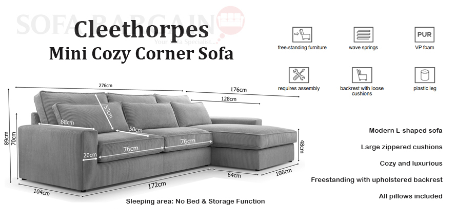 This expansive and inviting piece stands as the perfect proposition for your living room, providing a harmonious blend of style and relaxation. Indulge in the plush comfort of the spacious seating area adorned with a comfortable backrest, accentuated by additional densely filled cushions for an elevated level of coziness. The Cleethorpes Mini Cozy Corner Sofa brings comfort, style, and smart design together. It’s a compact L shape couch perfect for any living room, guest space, or apartment.