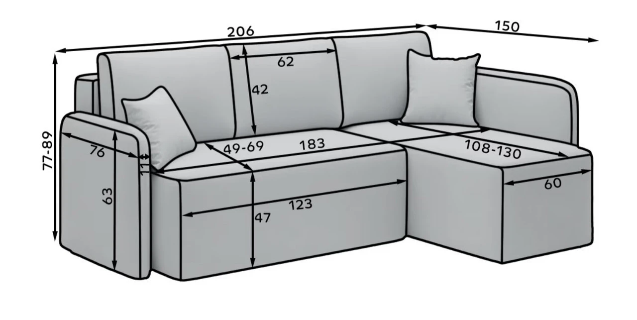 The CloudEase Corner Sofa Bed with Storage is an elegant piece of furniture that will add a modern character to your interior. With an impressive width of 206 cm and a depth of 150 cm, it provides a spacious area for the whole family to relax. With a height of 89 cm with cushions, CloudEase combines comfort with aesthetics. The seat depth of 49 cm and seat height of 47 cm offer a comfortable place to rest. CloudEase Corner Sofa Bed with Storage can also serve as a bed with an impressive area of 115x184 cm, perfect for guests. The sturdy 2.5 cm high legs add stability to the entire construction. The backrest height of 42 cm supports comfort during use. The DL mechanism allows for easy transformation of the corner into a comfortable sleeping space. CloudEase is not only stylish but also functional, bringing elegance to every room.