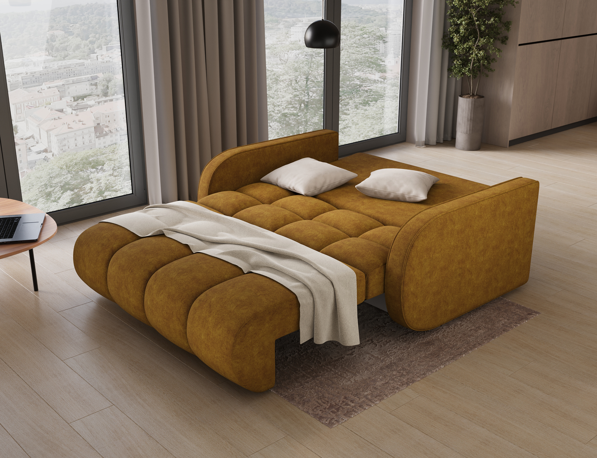Dursley 3 Seater offers not only aesthetics but also functionality. In just a few seconds, it transforms into a spacious bed measuring 131x203 cm, perfect for two people. An added bonus is the practical bedding compartment (124x66x15 cm), where you can easily store duvets, pillows, or seasonal linens. This makes it easier to keep your space tidy and organized while maximizing living area efficiency.