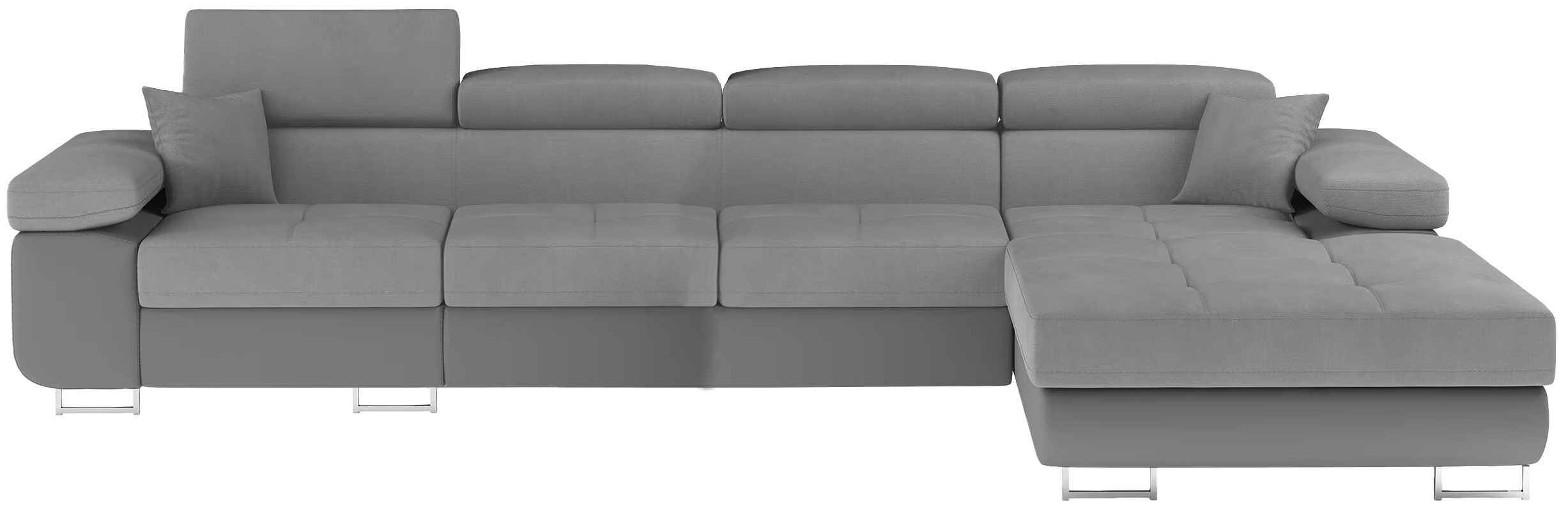 Modern interiors are very refined in appearance. The constraint in the use of accent features lends itself to creating a unique ambiance and space to enjoy your relaxation. If you are about to outfit your living room in a new look, and you are seeking upholstered furniture that is as superbly comfortable as you have been dreaming it to be, then the supple Edinburgh corner sofa bed long with storage is your choice. The L-shaped layout features large seat cushions accented by fine tufting and elegant stitching. The wide armrests and optimally profiled backrests provide a great sense of relaxation, elevated further by adjustable headrests. The tall metal legs in polished chrome enhance the stunning appearance. The Edinburgh corner sofa bed long with storage is available in a variety of colour versions, each combining two contrasting shades to give it an even more unique look, and delightful in the quality of modern design.