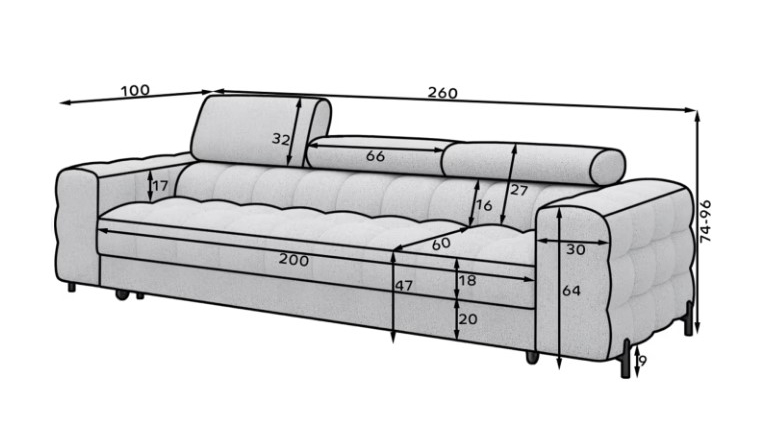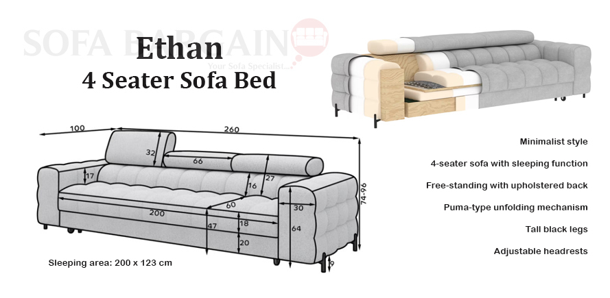 The modern character of the sofa is emphasized by the black metal legs with a height of 9 cm, which ensure stability and make cleaning easier. The dimensions of the sofa are 260x100x96 cm, making it a spacious and functional piece of furniture for any interior. The Ethan 4 Seater Sofa Bed combines style, comfort, and durability, making it the ideal choice for modern living room arrangements.