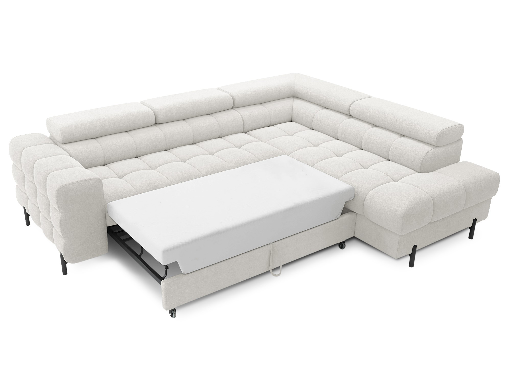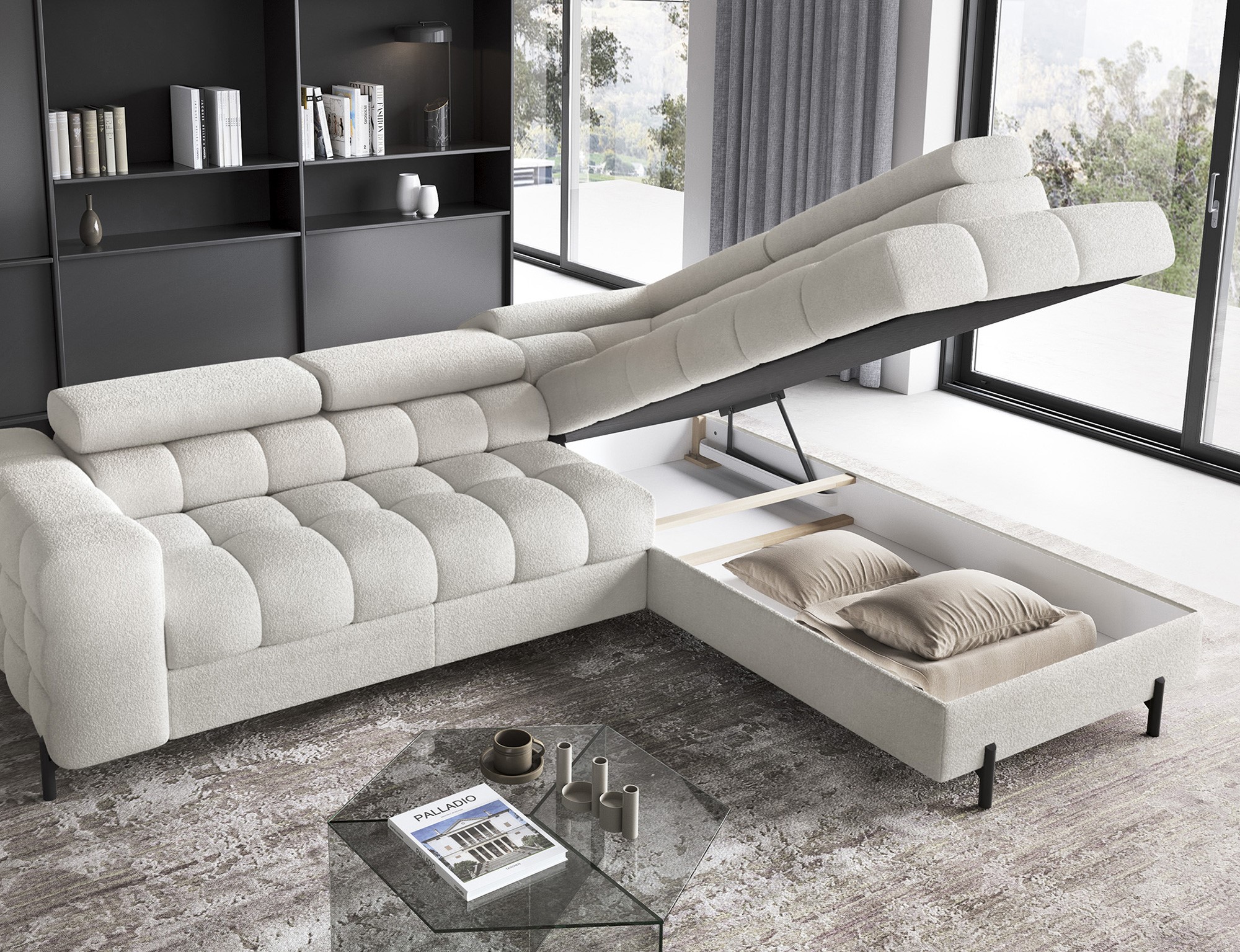The Ethan Corner Sofa Bed with Storage is a modern piece of furniture that combines functionality and aesthetics, fitting perfectly into various interior design styles, from loft to rustic. With its impressive width of 276 cm and depth of 200 cm, it offers ample space for relaxation. The adjustable headrests and upholstered back ensure comfort during daily use and relaxation.