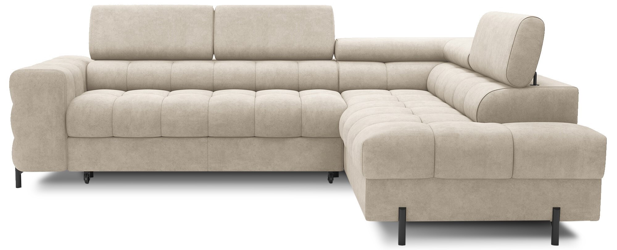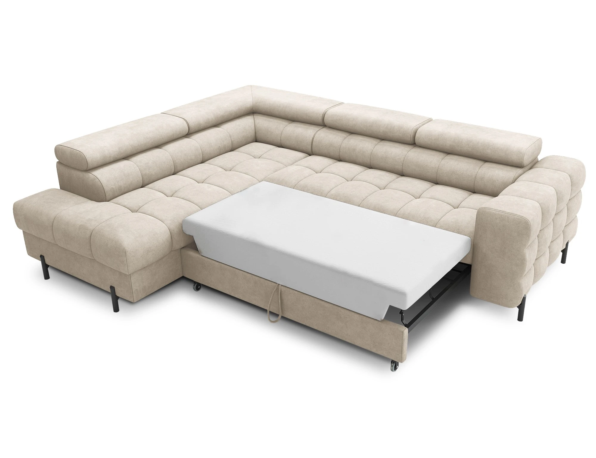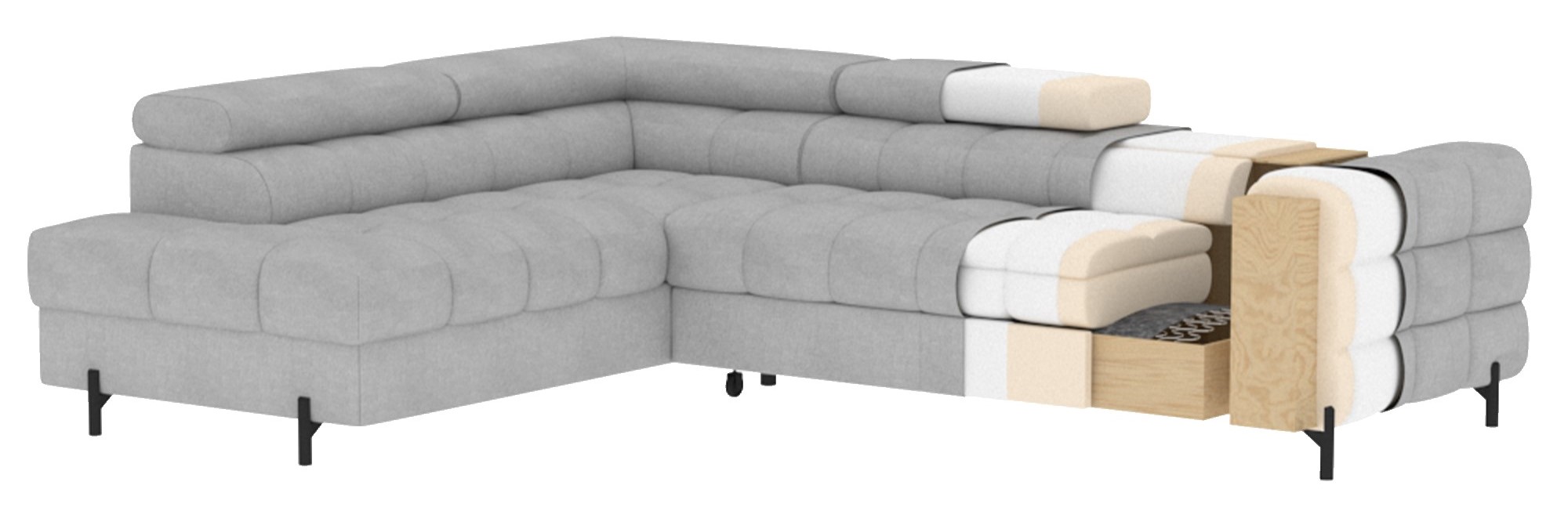 The Ethan Corner Sofa Bed with Storage is a modern piece of furniture that combines functionality and aesthetics, fitting perfectly into various interior design styles, from loft to rustic. With its impressive width of 276 cm and depth of 200 cm, it offers ample space for relaxation. The adjustable headrests and upholstered back ensure comfort during daily use and relaxation.