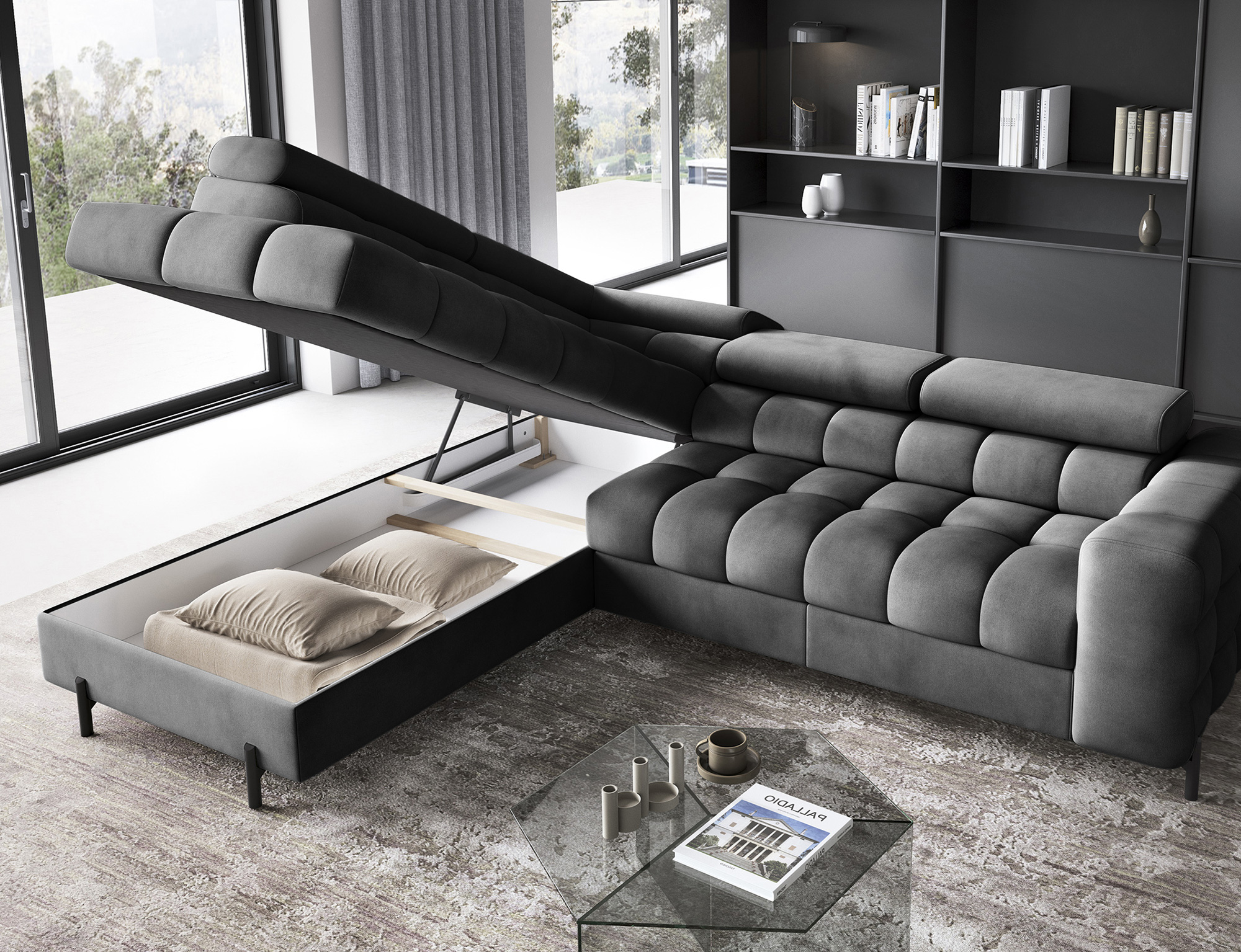 The sofa is equipped with a sleeping function with the Dolphin system, allowing for quick and easy unfolding to a surface of 123x193 cm. Additionally, it features a storage compartment for bedding measuring 180x92x17 cm, providing practical storage options.