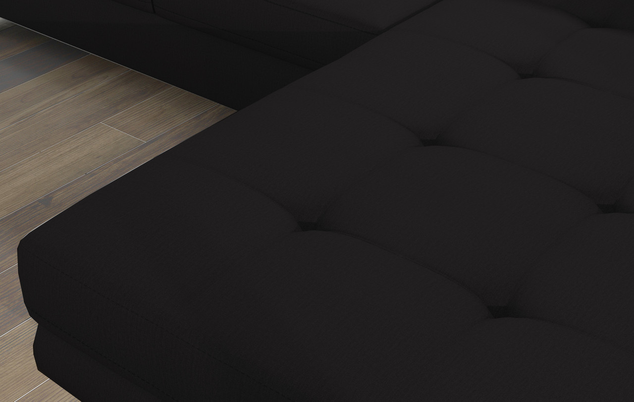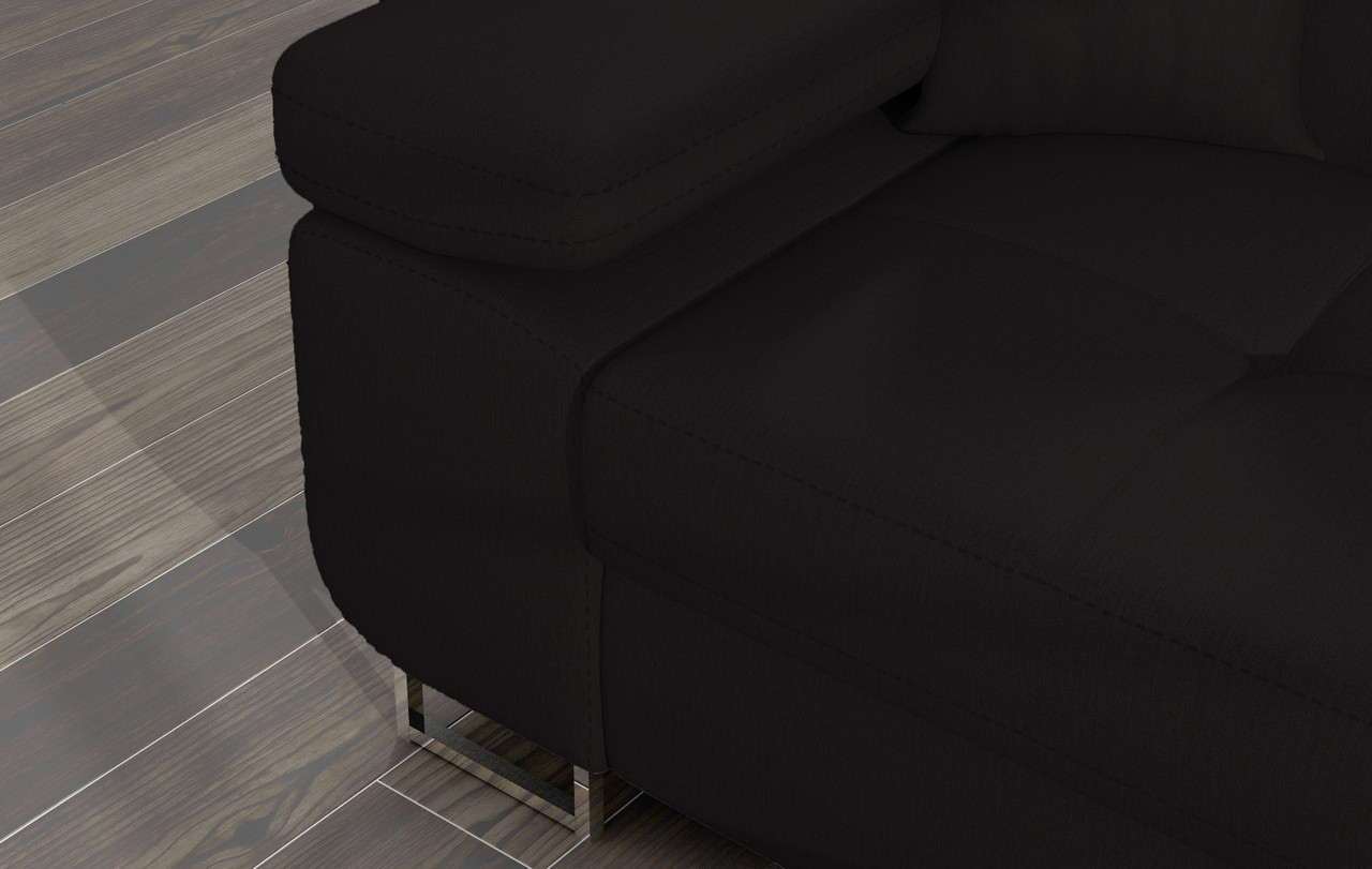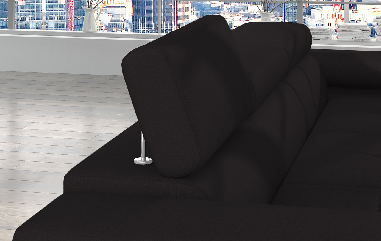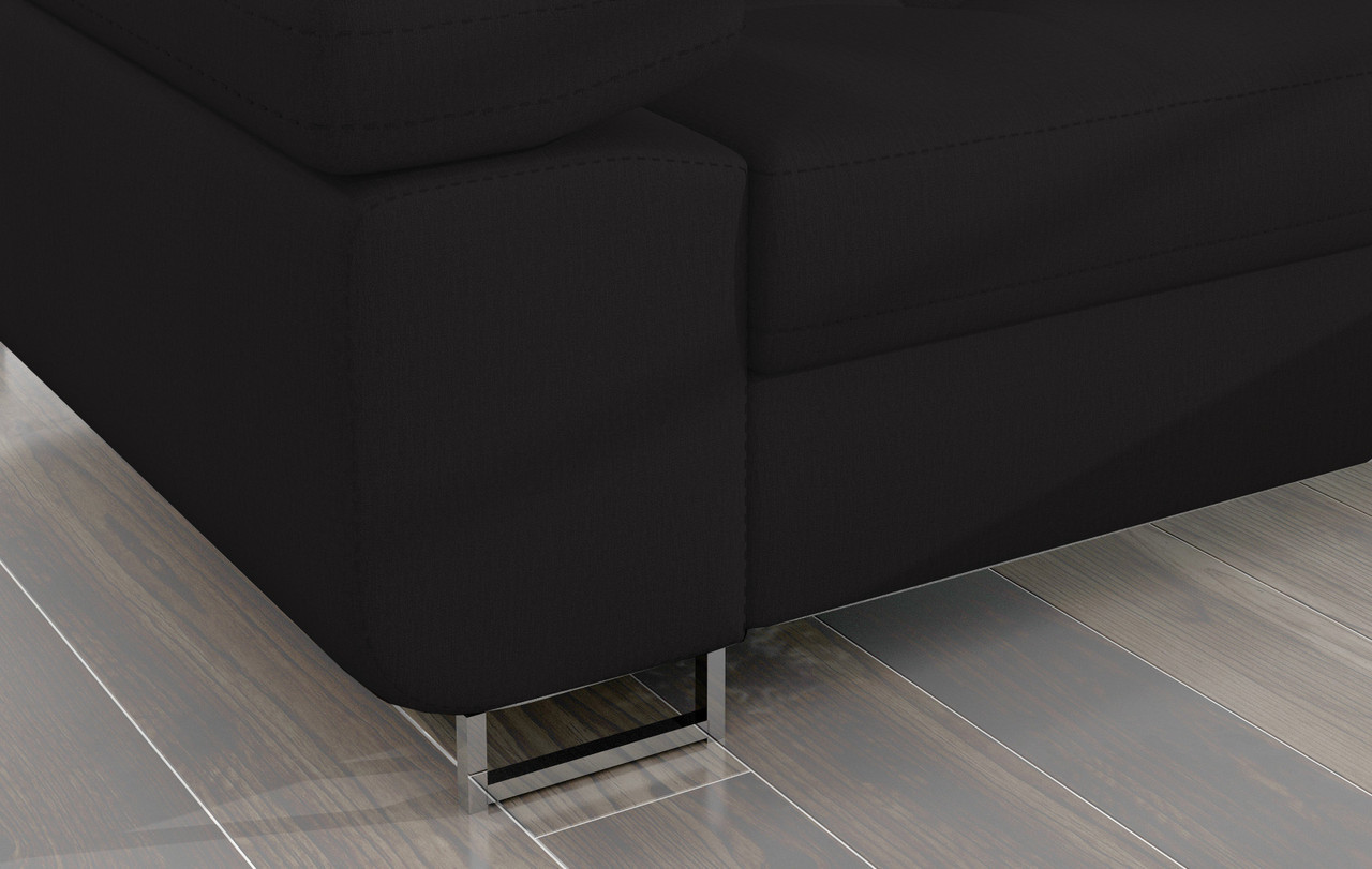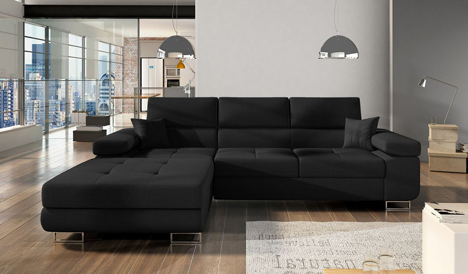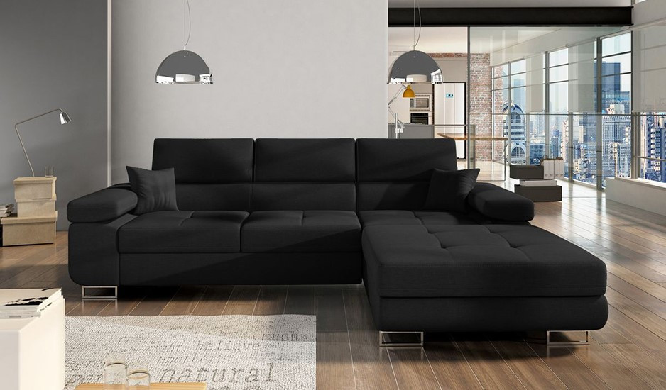 Modern interiors are very refined in appearance. The constraint in the use of accent features lends itself to creating a unique ambiance and space to enjoy your relaxation. If you are about to outfit your living room in a new look, and you are seeking upholstered furniture that is as superbly comfortable as you have been dreaming it to be, then the supple Amy corner sofa bed with storage is your choice. The L-shaped layout features large seat cushions accented by fine tufting and elegant stitching. The wide armrests and optimally profiled backrests provide a great sense of relaxation, elevated further by adjustable headrests. The tall metal legs in polished chrome enhance the stunning appearance. The Amy corner sofa bed with storage is available in Black fabric or can be upgraded to Black easy clean velvet or Black eco leather to give it an even more unique look, and delightful in the quality of modern design..