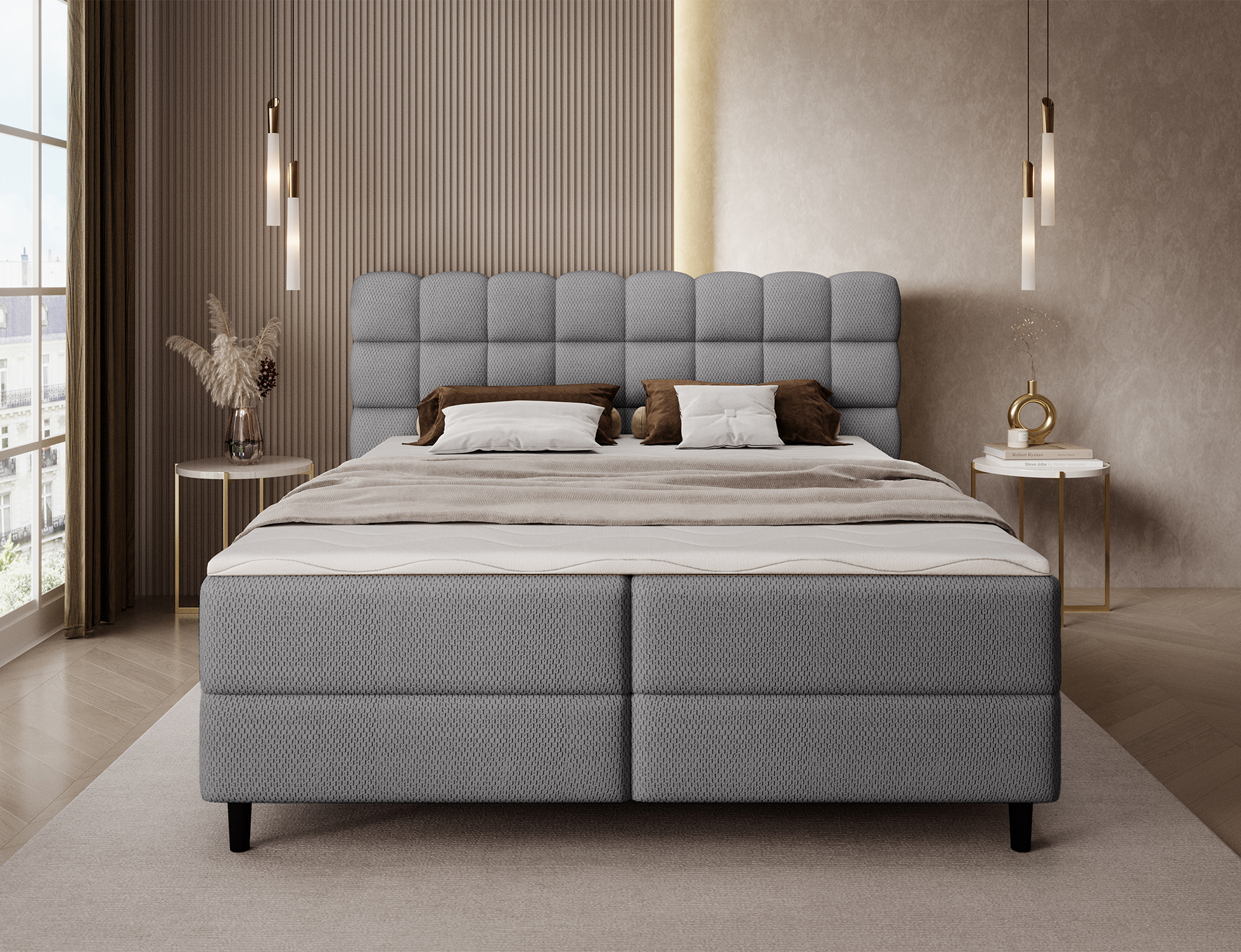 The Fancy Spring Box Bed is the perfect combination of modern form and elegant style, bringing a unique character to any bedroom. Its distinctive quilted headboard with a height of 102 cm impresses with its appearance while providing comfortable support for reading, relaxing, or watching TV. The solid construction, upholstered in a soft-touch fabric, ensures that the Fancy model beautifully combines aesthetics with durability.