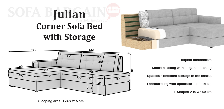 The Julian Corner Sofa Bed with Storage is a perfect choice for those who appreciate stylish and functional furniture. Its modern shape, subtle tufting on the seat, and elegant upholstery make it a great fit for both classic and minimalist interiors. With a fully upholstered back, it can be placed anywhere in the living room, creating a striking relaxation area.