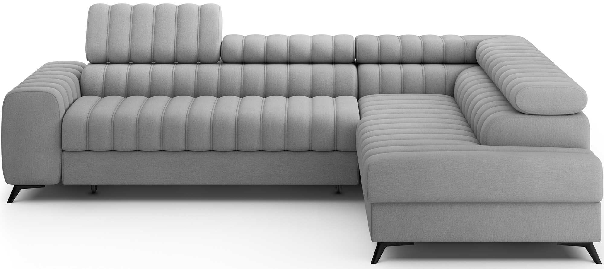 Kearsley is a practical corner sofa with a sleeping function, equipped with a durable and easy-to-use dolphin-type mechanism. When unfolded, it transforms into a comfortable sleeping surface measuring 124 x 194 cm, ideal for everyday or occasional use. The model also features a spacious bedding storage compartment (180 x 92 x 17 cm) for convenient organization of textiles. Additionally, adjustable headrests allow you to customize the backrest height to your individual needs, ensuring optimal head and neck support. The 49 cm seat height guarantees comfortable everyday use.