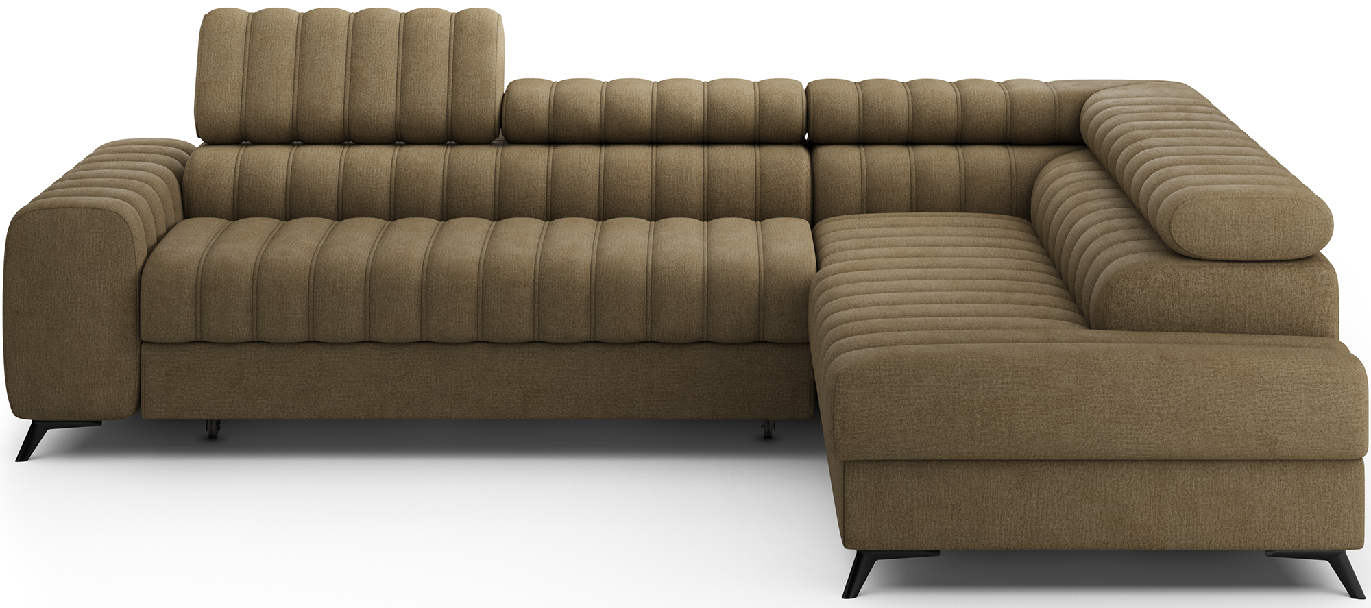 Kearsley is a practical corner sofa with a sleeping function, equipped with a durable and easy-to-use dolphin-type mechanism. When unfolded, it transforms into a comfortable sleeping surface measuring 124 x 194 cm, ideal for everyday or occasional use. The model also features a spacious bedding storage compartment (180 x 92 x 17 cm) for convenient organization of textiles. Additionally, adjustable headrests allow you to customize the backrest height to your individual needs, ensuring optimal head and neck support. The 49 cm seat height guarantees comfortable everyday use.