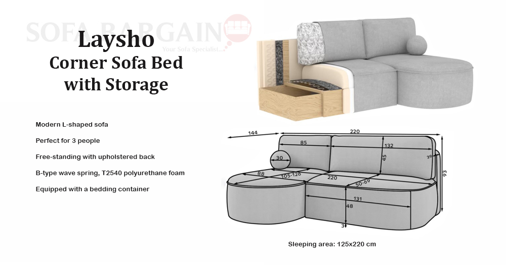 The Laysho model is equipped with a convenient DL sleeping mechanism, allowing you to quickly and easily transform the sofa into a bed. The generous sleeping area of 125 x 220 cm ensures comfortable rest for two people. An additional advantage is the practical bedding storage compartment measuring 50 x 104 x 24 cm, ideal for storing duvets and pillows. The fully upholstered back makes it possible to place the sofa in the center of the room.