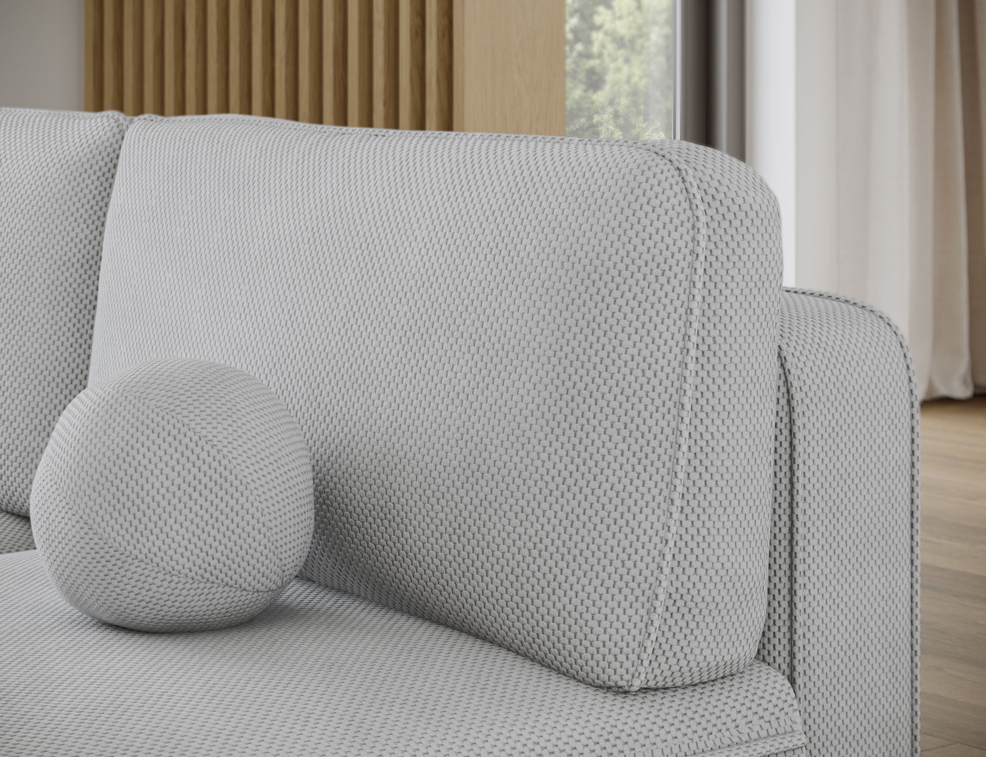 The Laysho corner sofa bed with storage is a perfect solution for a modern living room where both style and comfort matter. Its minimalist design and carefully refined details make it an excellent fit for Scandinavian, contemporary, and modern interiors. With overall dimensions of 220 x 144 x 93 cm, this model works perfectly in both smaller apartments and spacious living areas, creating a comfortable relaxation space for the whole family.