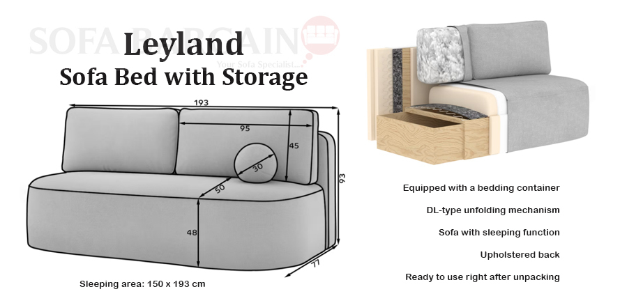 The Leyland sofa features a convenient sleeping function with a surface of 150 × 193 cm, perfect for occasional overnight guests. The DL folding mechanism allows you to easily convert the sofa into a comfortable bed in seconds. It also includes a bedding storage compartment measuring 54 × 147 × 24 cm, ideal for storing blankets, pillows, or other textiles. This makes the Leyland sofa an excellent choice for those who appreciate style, functionality, and everyday comfort.