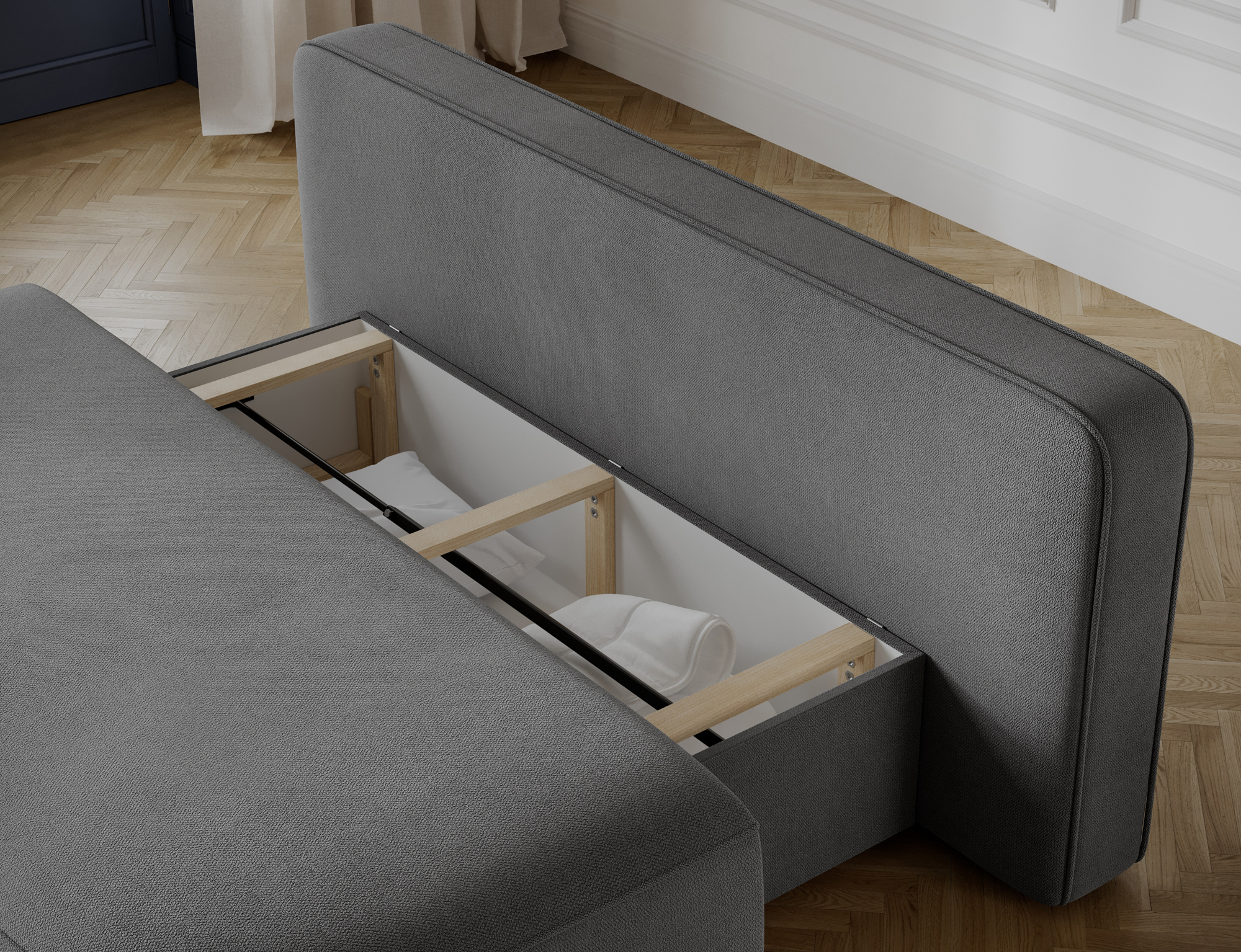 The Leyland sofa features a convenient sleeping function with a surface of 150 × 193 cm, perfect for occasional overnight guests. The DL folding mechanism allows you to easily convert the sofa into a comfortable bed in seconds. It also includes a bedding storage compartment measuring 54 × 147 × 24 cm, ideal for storing blankets, pillows, or other textiles. This makes the Leyland sofa an excellent choice for those who appreciate style, functionality, and everyday comfort.