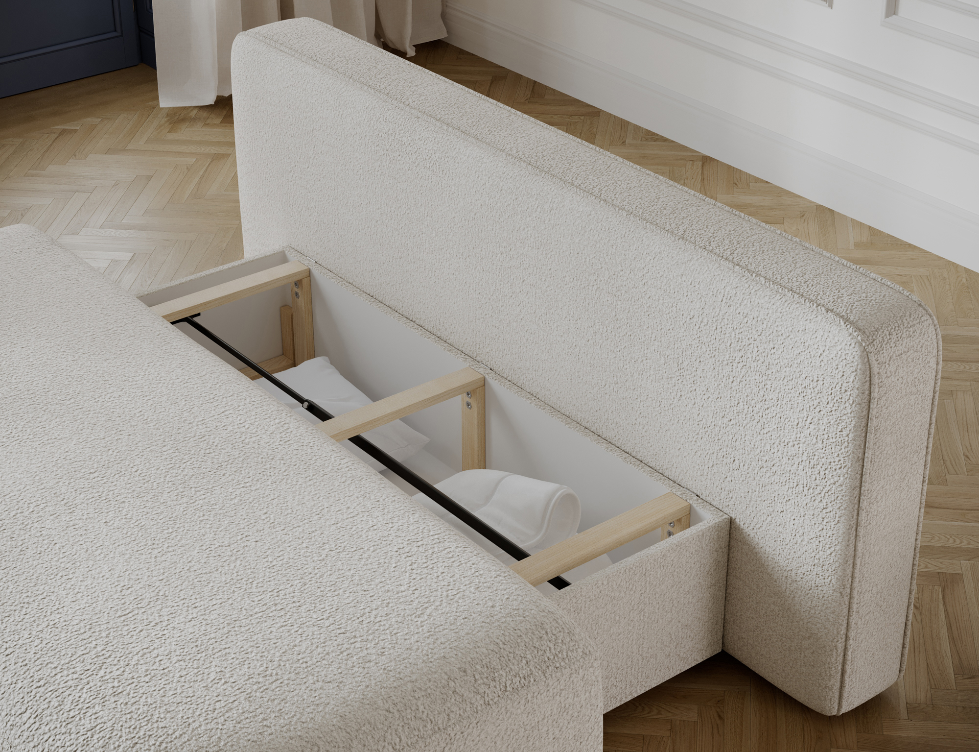 The Leyland sofa features a convenient sleeping function with a surface of 150 × 193 cm, perfect for occasional overnight guests. The DL folding mechanism allows you to easily convert the sofa into a comfortable bed in seconds. It also includes a bedding storage compartment measuring 54 × 147 × 24 cm, ideal for storing blankets, pillows, or other textiles. This makes the Leyland sofa an excellent choice for those who appreciate style, functionality, and everyday comfort.