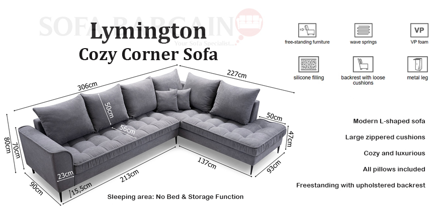 Lymington Cozy Corner Sofa is ​​constructed on a wooden frame with the addition of MDF and particleboard. The seat is supported by sinuous springs, which provide flexibility and prevent sagging during everyday use. The backrest and sides are made of softwood, further increasing their resistance to mechanical damage. The entire chair rests on easily removable metal legs.