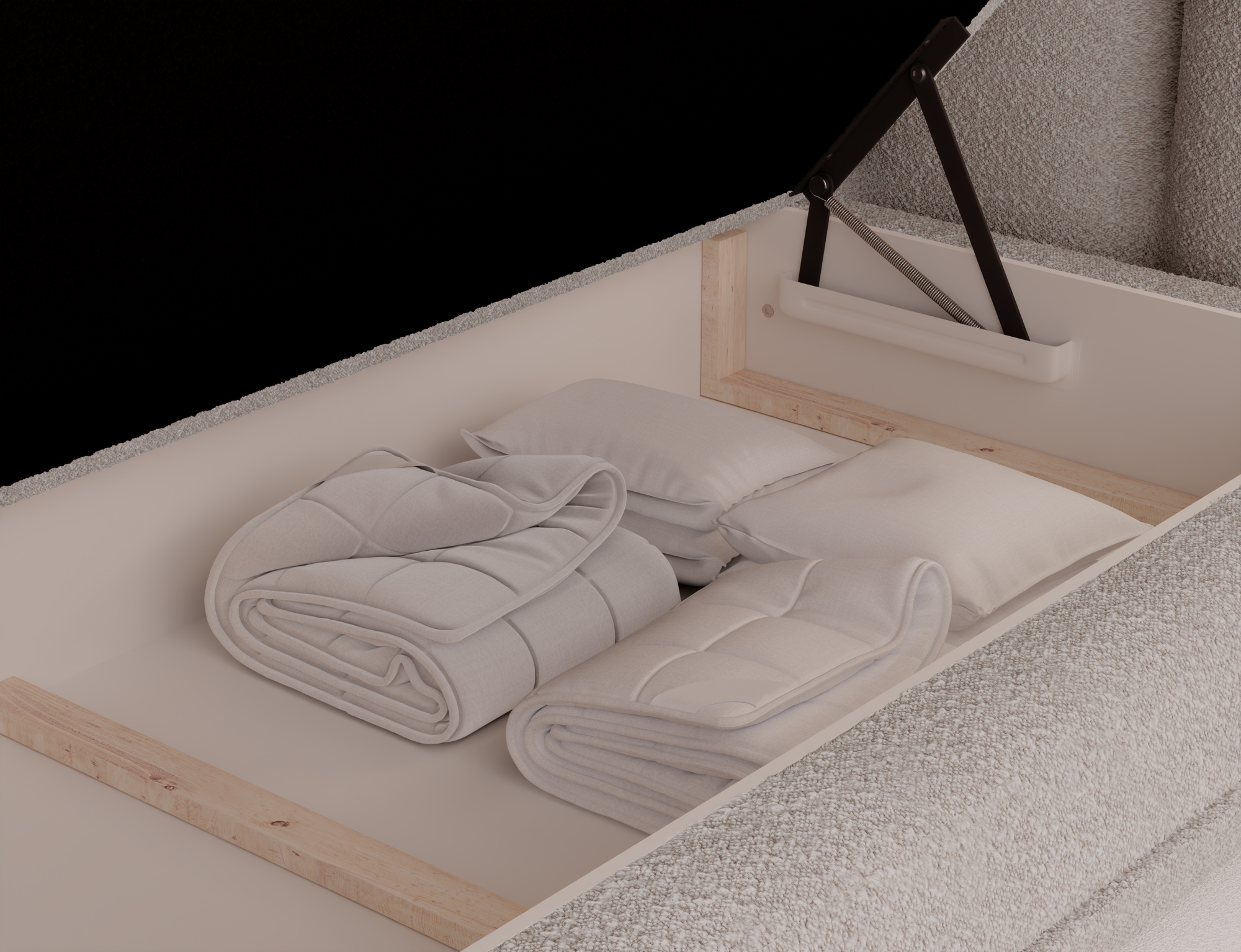 An additional advantage of the Salbabida bed is the practical bedding storage compartment, which offers convenient space for storing duvets, pillows or seasonal textiles, helping to keep your bedroom neat and organized. Solid craftsmanship and high-quality materials ensure durability and long-lasting comfort.