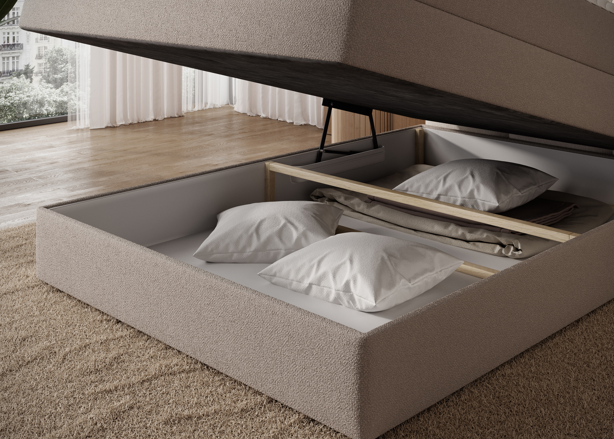 The Singles Spring Box Bed is available in two space-efficient sizes – 120x200 cm and 140x200 cm – making it ideal for smaller bedrooms, guest rooms, or studio apartments. It features a built-in bedding storage compartment, allowing you to keep your space tidy while optimizing functionality without sacrificing style.