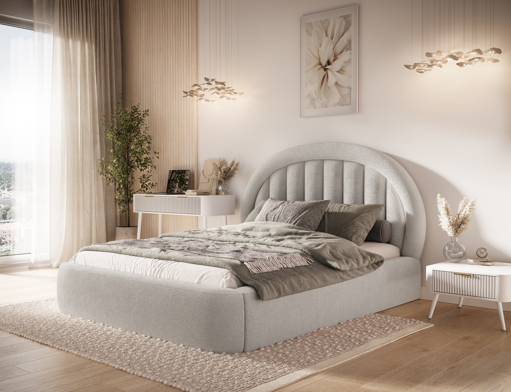 The Tadeo bed combines exceptional design with maximum functionality, bringing a sense of luxury and comfort to your bedroom. Its distinctive, semi-circular headboard with vertical stitching catches the eye and adds an elegant touch to any interior. The soft upholstery and refined details make it a piece that impresses both in style and in comfort.