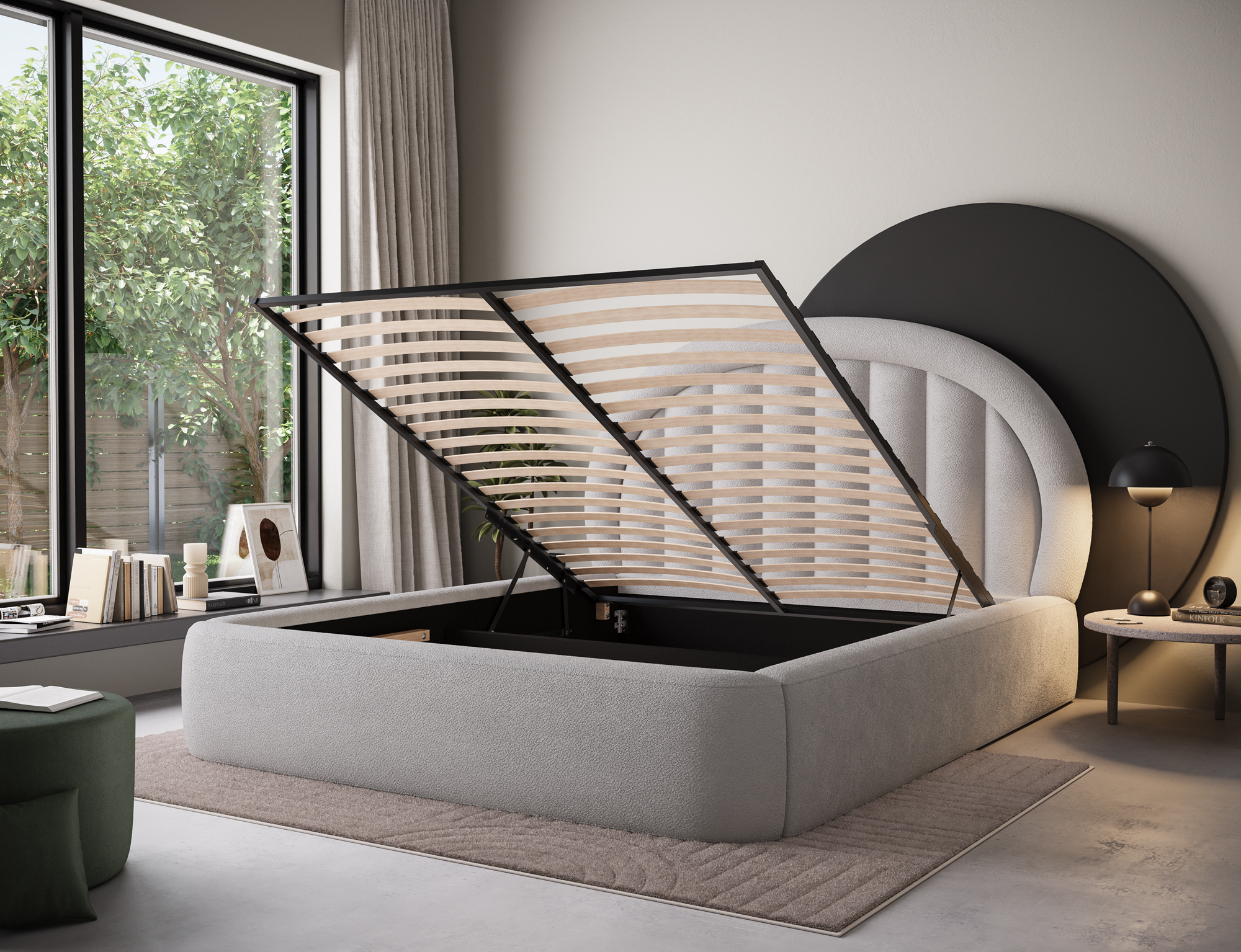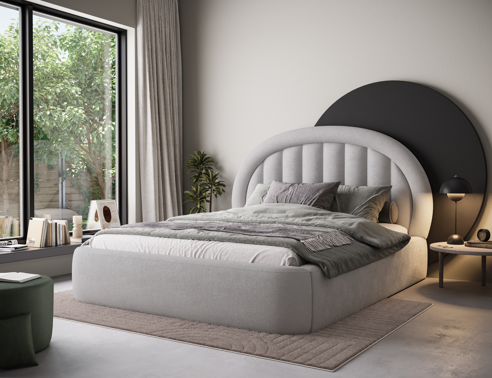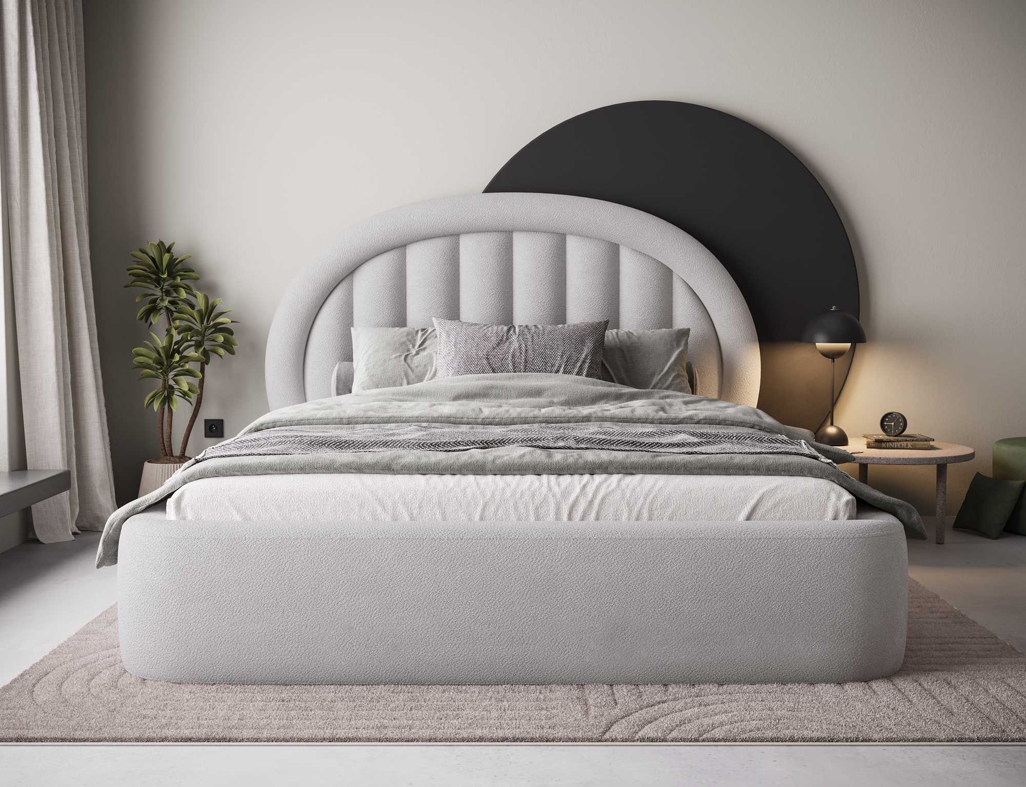 The Tadeo bed combines exceptional design with maximum functionality, bringing a sense of luxury and comfort to your bedroom. Its distinctive, semi-circular headboard with vertical stitching catches the eye and adds an elegant touch to any interior. The soft upholstery and refined details make it a piece that impresses both in style and in comfort.