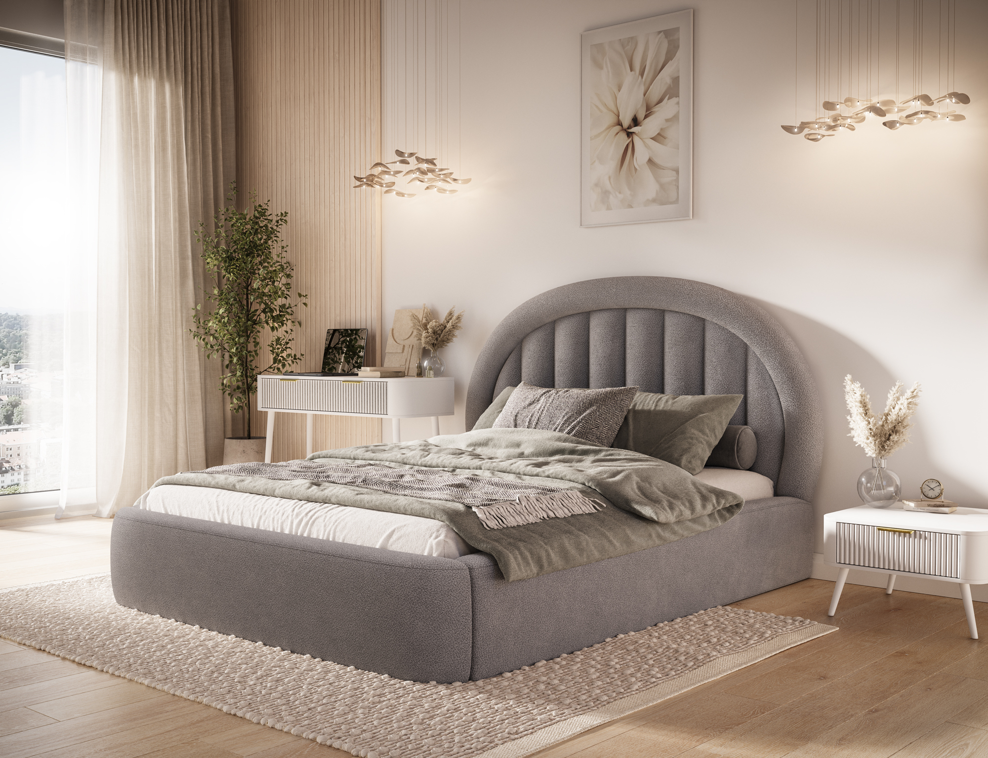 The Tadeo bed combines exceptional design with maximum functionality, bringing a sense of luxury and comfort to your bedroom. Its distinctive, semi-circular headboard with vertical stitching catches the eye and adds an elegant touch to any interior. The soft upholstery and refined details make it a piece that impresses both in style and in comfort.