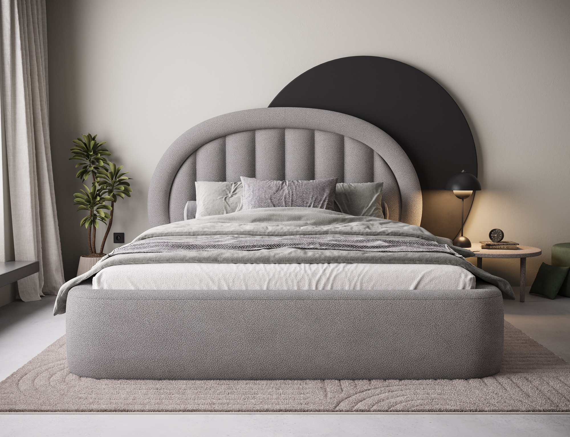 The Tadeo bed combines exceptional design with maximum functionality, bringing a sense of luxury and comfort to your bedroom. Its distinctive, semi-circular headboard with vertical stitching catches the eye and adds an elegant touch to any interior. The soft upholstery and refined details make it a piece that impresses both in style and in comfort.
