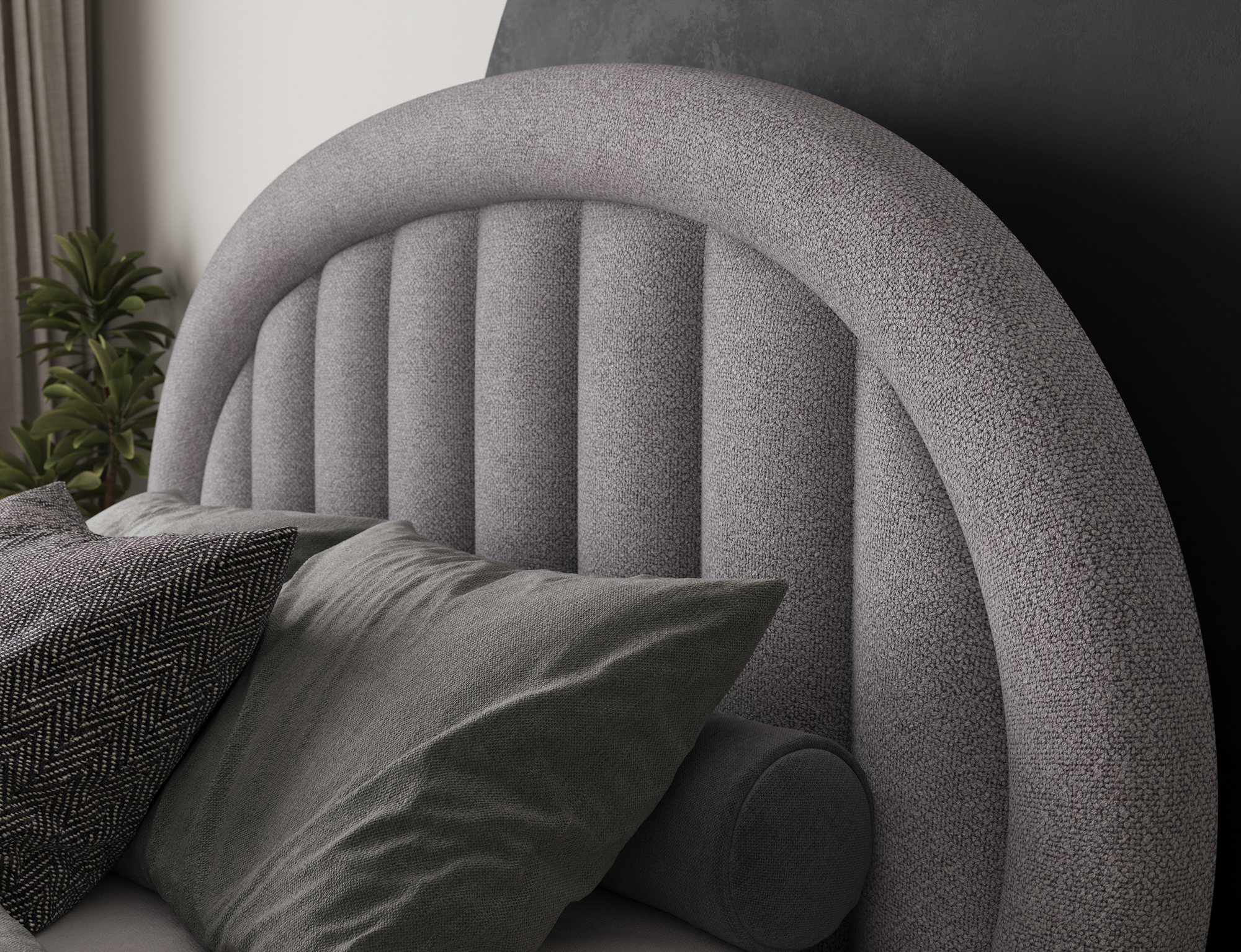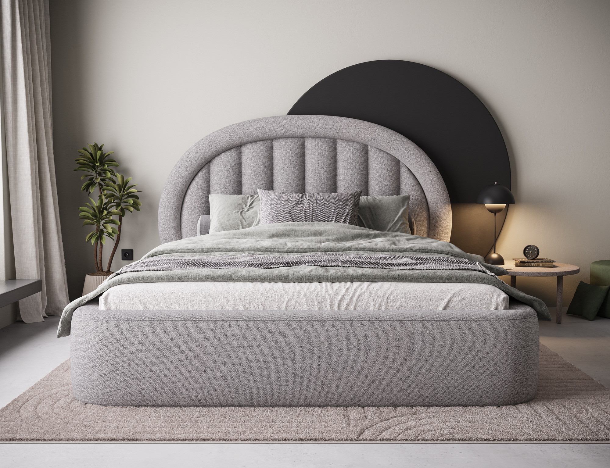 The Tadeo bed combines exceptional design with maximum functionality, bringing a sense of luxury and comfort to your bedroom. Its distinctive, semi-circular headboard with vertical stitching catches the eye and adds an elegant touch to any interior. The soft upholstery and refined details make it a piece that impresses both in style and in comfort.