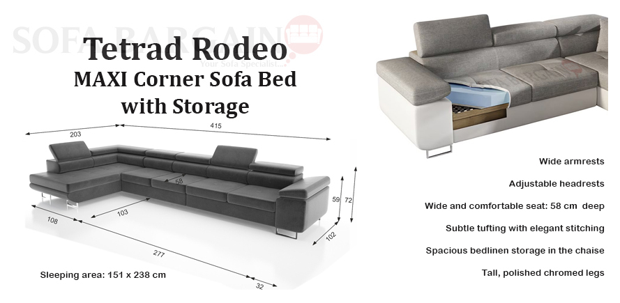 Modern interiors are very refined in appearance. The constraint in the use of accent features lends itself to creating a unique ambiance and space to enjoy your relaxation. If you are about to outfit your living room in a new look, and you are seeking upholstered furniture that is as superbly comfortable and large as you have been dreaming it to be, then the Tetrad Rodeo MAXI corner sofa bed with storage is your choice. The L-shaped layout features large seat cushions accented by fine tufting and elegant stitching. The wide armrests and optimally profiled backrests provide a great sense of relaxation, elevated further by adjustable headrests. The tall metal legs in polished chrome enhance the stunning appearance. The Tetrad Rodeo corner sofa bed with storage is available in a variety of colours and can be upgraded to easy clean fabric to give it an even more unique look, and delightful in the quality of modern design..