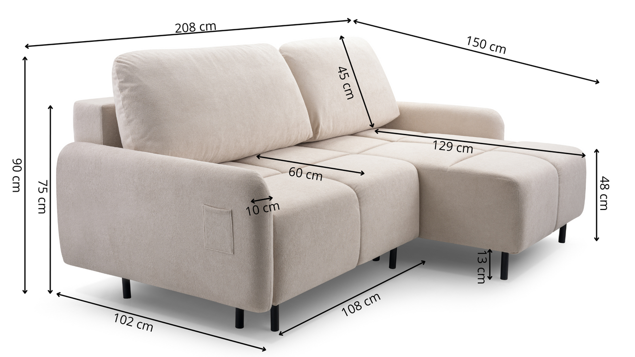 • Spacious Layout: 208 × 150 cm corner footprint, left or right corner configuration, fits snugly into your living space.