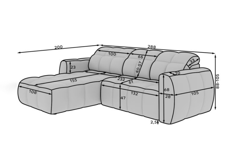 The Titi corner sofa bed is an excellent choice for those who value modern style, comfort, and functionality in their living space. With generous dimensions of 288 × 200 × 105 cm, it perfectly fills the living room, offering a spacious and comfortable seating area for the whole family. Soft, wide seats and an elegant silhouette follow current interior design trends, making it a great fit for both minimalist and contemporary interiors.
