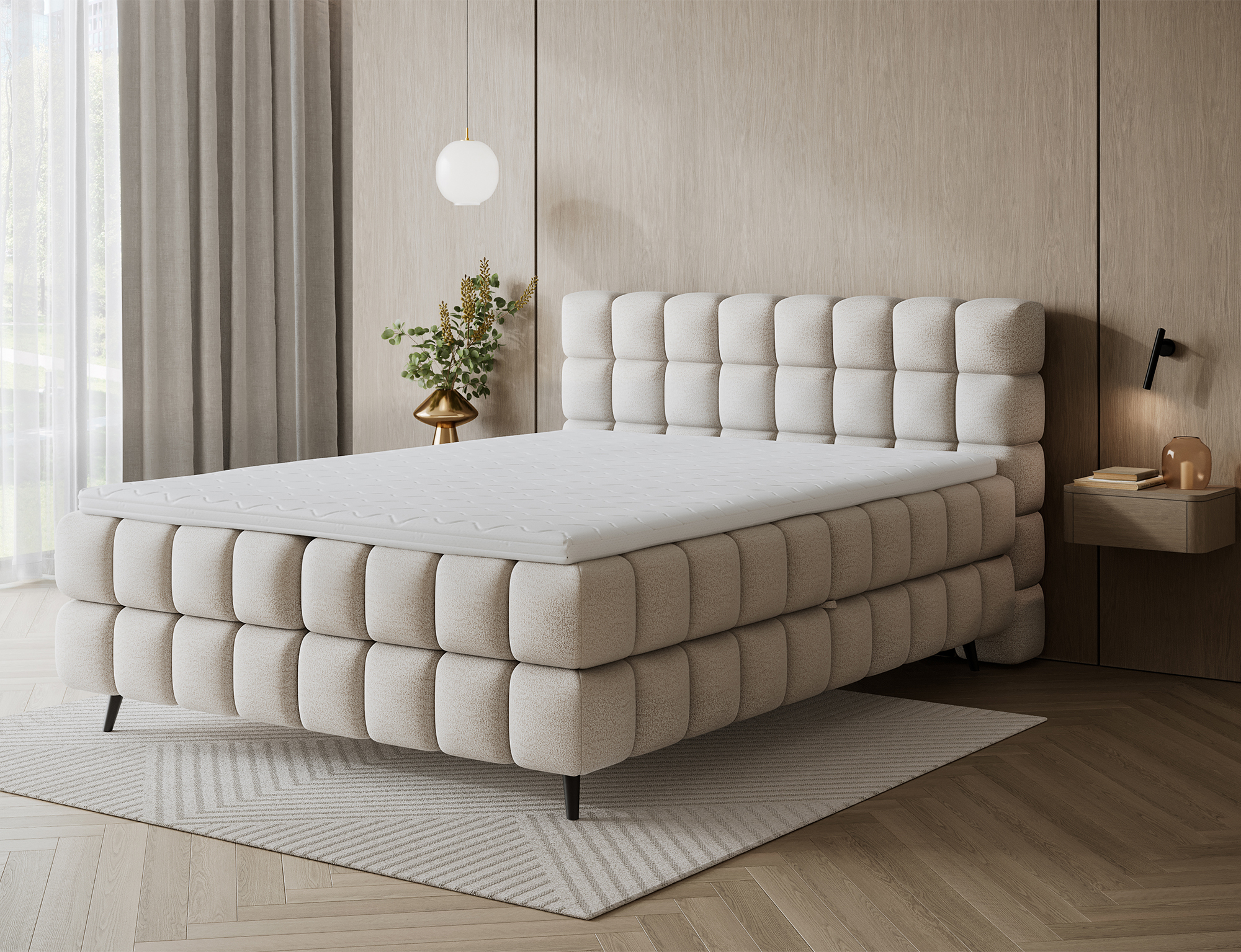 The Top model is crafted with your comfort in mind. Its base combines bonell springs with T2540 foam, providing optimal body support and perfect air circulation throughout the night. The headboard is filled with T2130 polyurethane foam, ensuring a soft yet supportive surface — ideal for reading or watching TV in bed. The seat height of 51 cm makes getting in and out of bed effortless while adding to the overall sense of comfort.