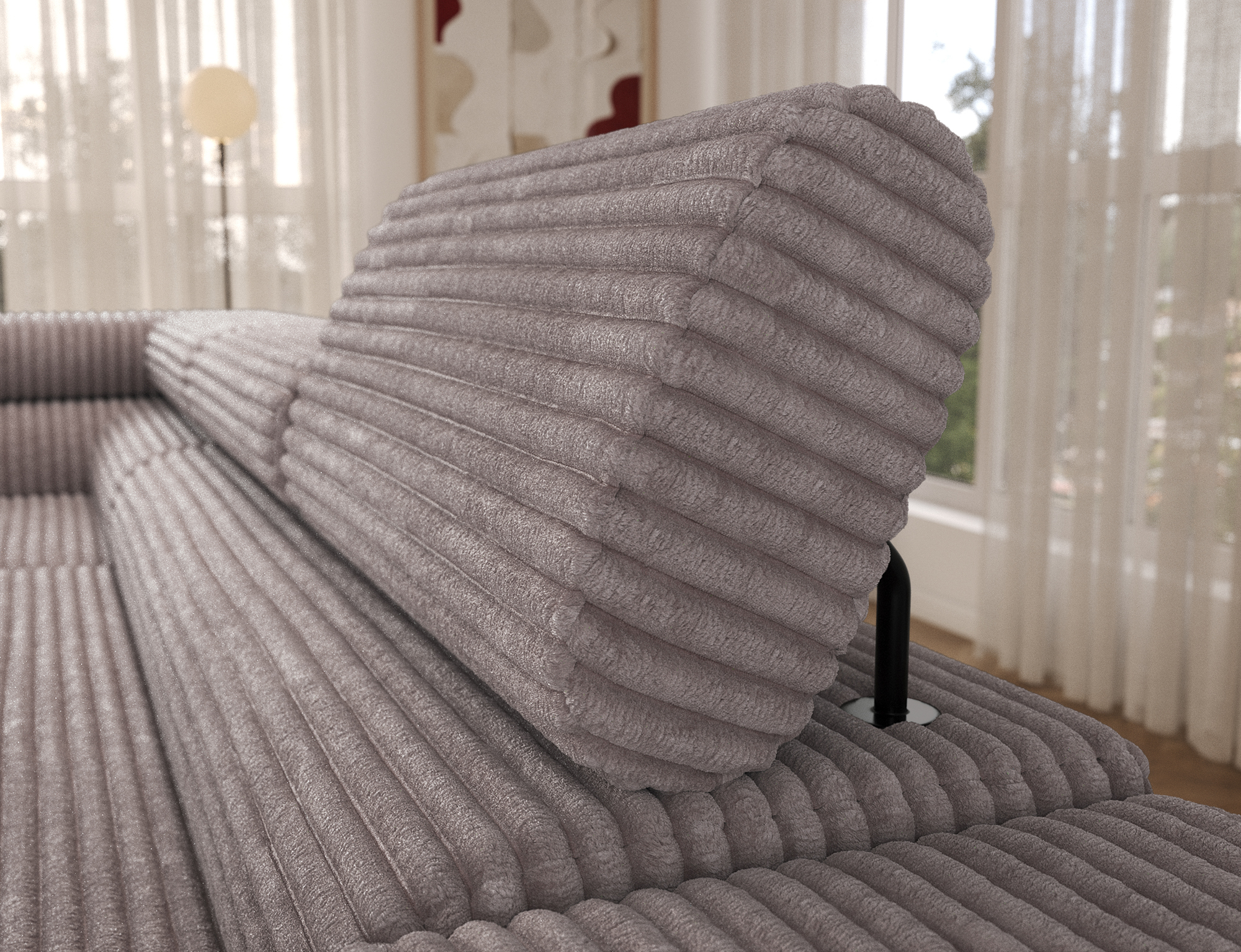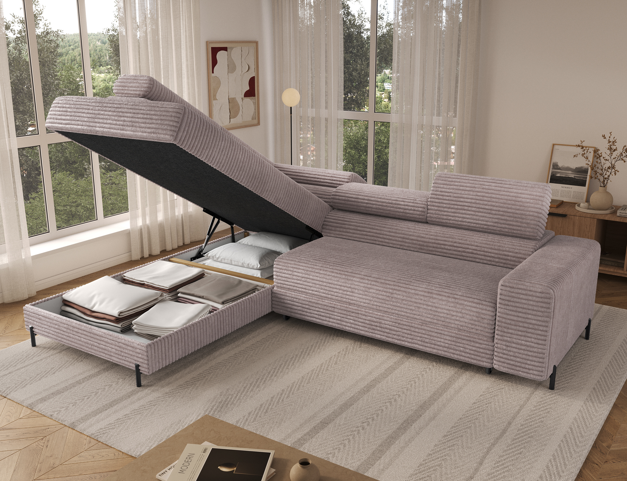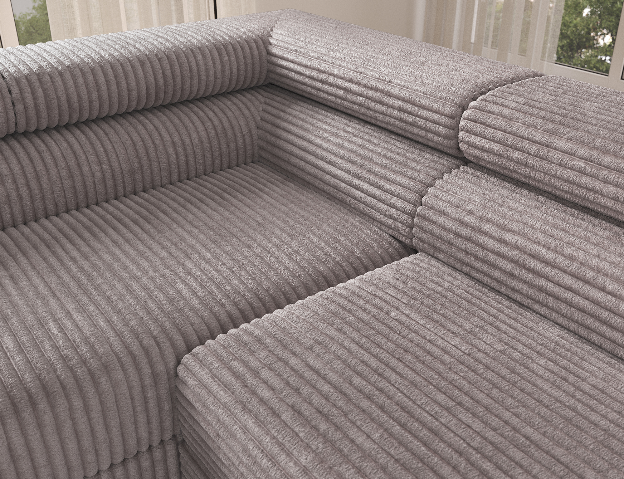 Adjustable headrests allow individual adjustment of the backrest height, enhancing seating and relaxation comfort. The Wakefield corner sofa fits perfectly into current interior design trends, combining aesthetics with functionality. It is an ideal choice for those looking for a large corner sofa with a sleeping function that becomes the focal point of the living space.