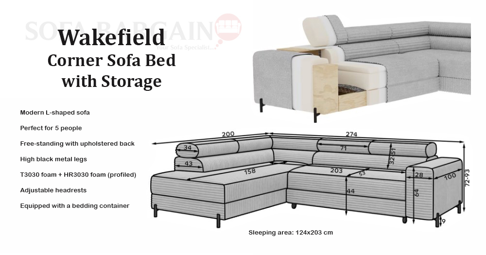 Adjustable headrests allow individual adjustment of the backrest height, enhancing seating and relaxation comfort. The Wakefield corner sofa fits perfectly into current interior design trends, combining aesthetics with functionality. It is an ideal choice for those looking for a large corner sofa with a sleeping function that becomes the focal point of the living space.