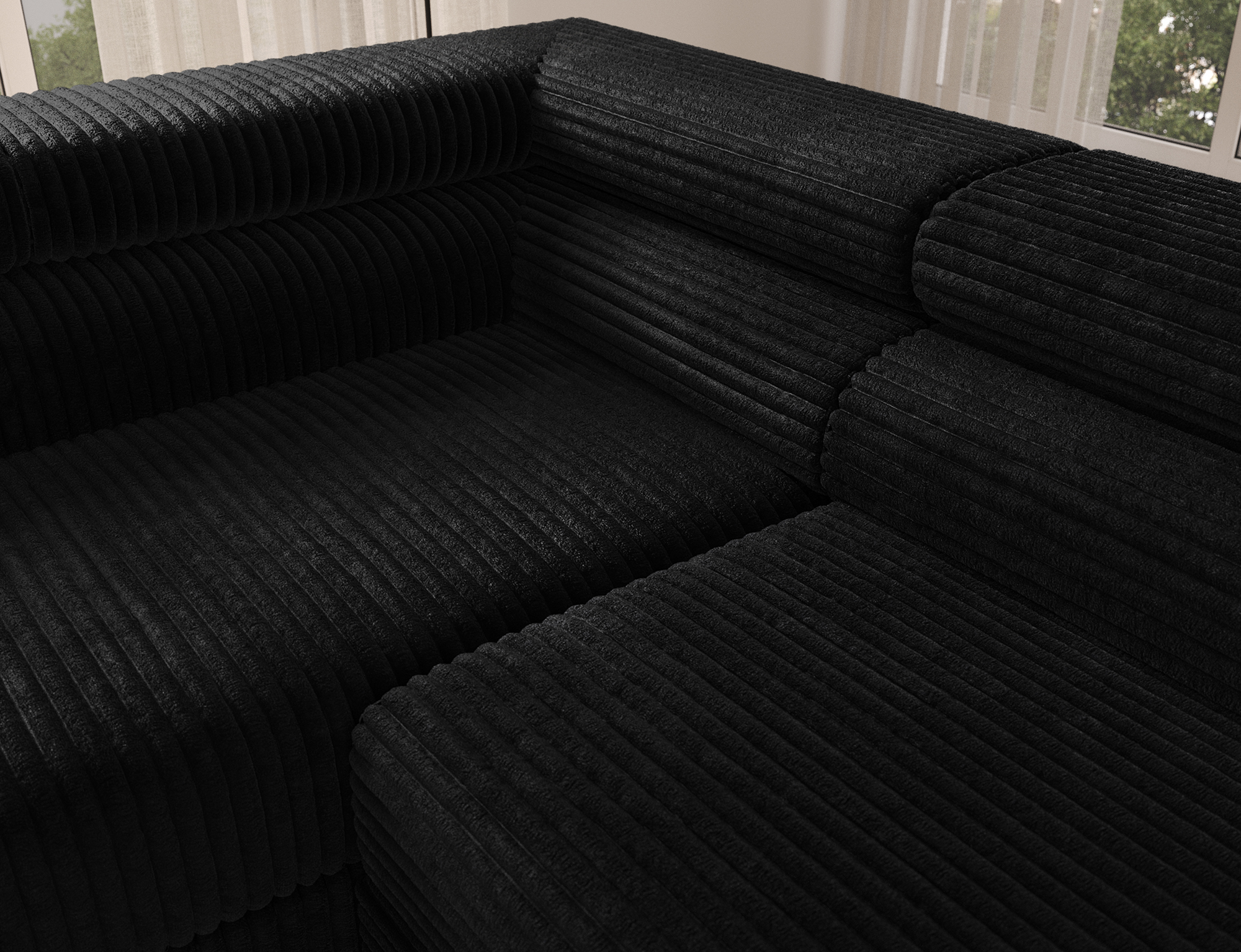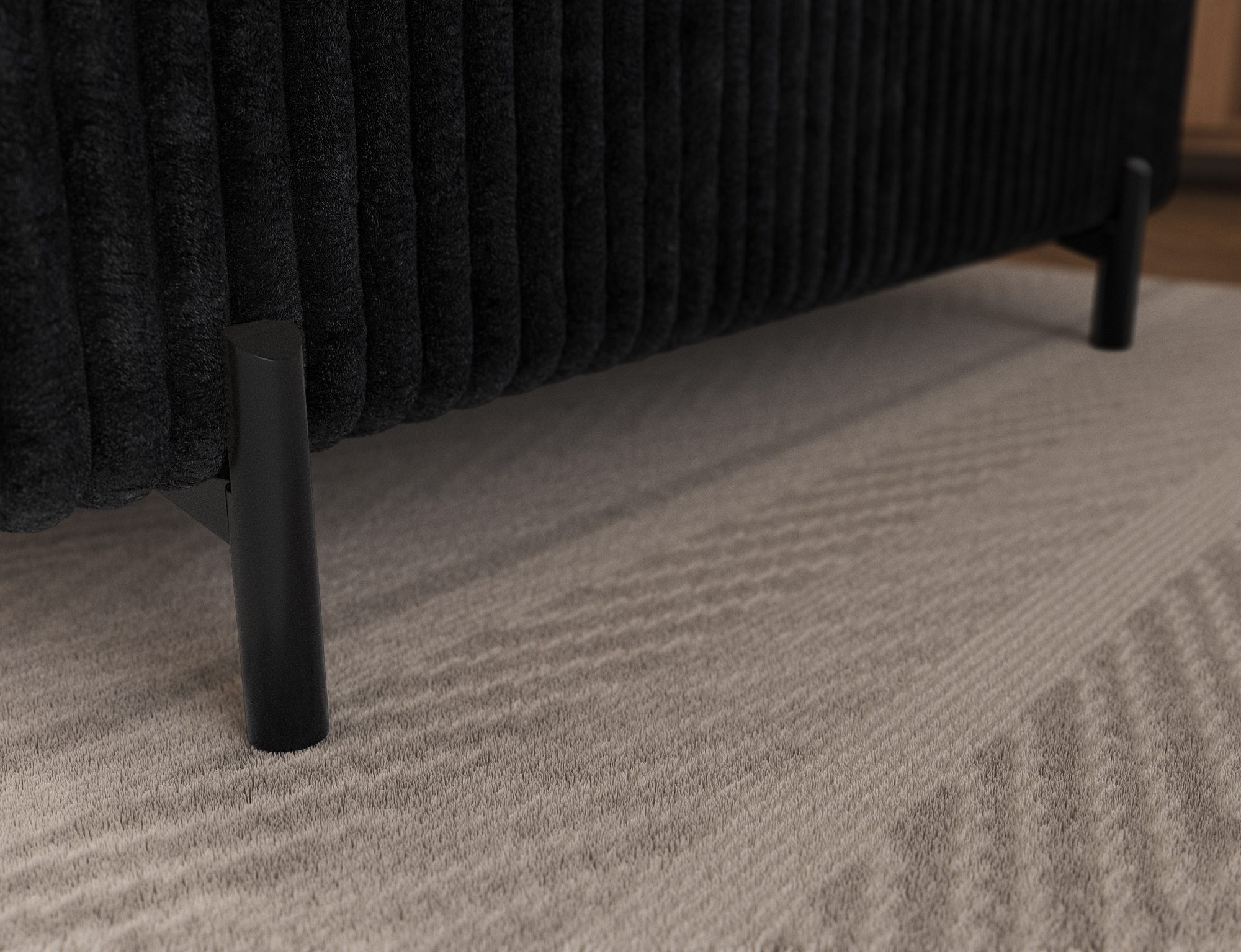 The Wakefield corner sofa is a modern living room corner sofa measuring 274x200x93 cm, combining elegant design with high functionality. Its clean, lightweight form is supported by 9 cm black powder-coated metal legs, giving the piece a contemporary and timeless look. The fully upholstered back allows the Wakefield corner sofa to be placed in the center of the room, offering greater freedom in interior arrangement.